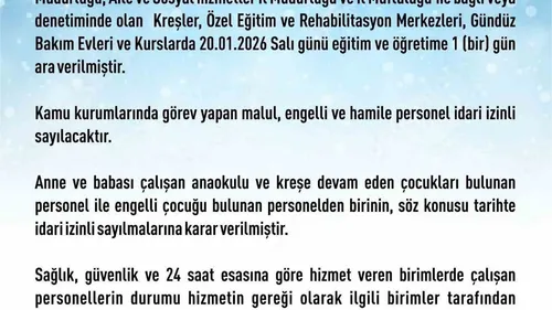 Elazığ Valiliği, yoğun kar ve buzlanma nedeniyle kreşler, özel eğitim/rehabilitasyon merkezleri, gündüz bakım evleri ve kurslarda salı günü eğitime 1 gün ara verildiğini açıkladı.