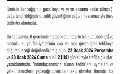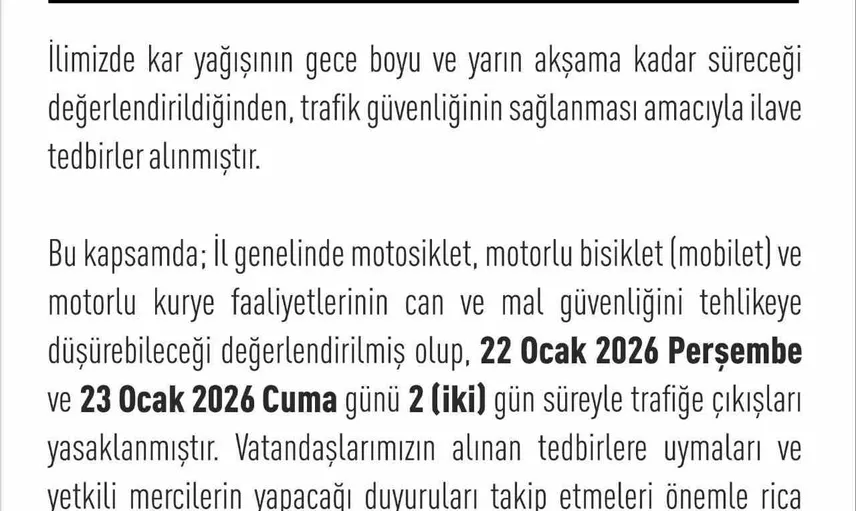 Valiliğin açıklamasında şu ifadelere yer verildi: "İlimizde kar yağışının gece boyu ve yarın akşama kadar süreceği değerlendirildiğinden, trafik güvenliğinin sağlanması amacıyla ilave tedbirler alınmıştır. Bu kapsamda; İl genelinde motosiklet, motorlu bisiklet (mobilet) ve motorlu kurye faaliyetlerinin can ve mal güvenliğini tehlikeye düşürebileceği değerlendirilmiş olup, 22 Ocak 2026 Perşembe ve 23 Ocak 2026 Cuma günü 2 (iki) gün süreyle trafiğe çıkışları yasaklanmıştır. Vatandaşlarımızın alınan tedbirlere uymaları ve yetkili mercilerin yapacağı duyuruları takip etmeleri önemle rica olunur".