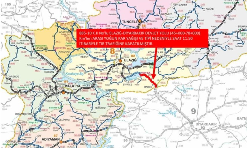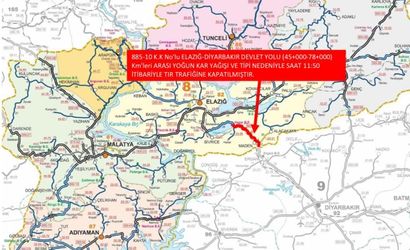 Karayolları Genel Müdürlüğü tarafından yapılan resmi açıklamada, Elazığ–Diyarbakır Yolu'nun 45-78. kilometreleri arasında, yoğun kar yağışı ve tipi nedeniyle ağır taşıt trafiğine geçici olarak kapatıldığı bildirildi.