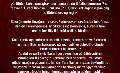 ELAZIĞSPOR, BAHİS SORUŞTURMASI KAPSAMINDA 5 FUTBOLCUSUNUN PFDK'YA SEVKİ ÜZERİNE BİR AÇIKLAMA YAYIMLADI