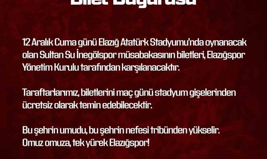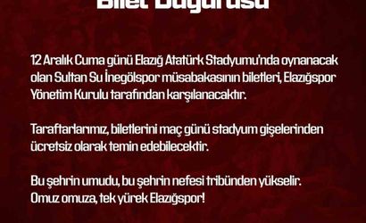Yönetim kurulu kararına göre, 12 Aralık Cuma günü Elazığ Atatürk Stadyumu'nda oynanacak olan Sultan Su İnegölspor müsabakasının biletleri kulüp tarafından karşılanacak. Taraftarlar biletlerini maç günü stadyum gişelerinden ücretsiz temin edebilecek.