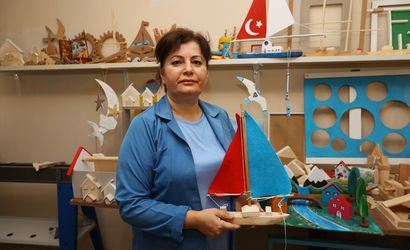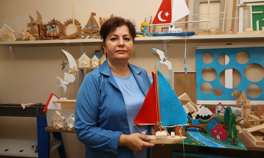 Trabzon'da 53 yaşındaki emekli öğretmen Gülen Deniz, yaşadığı apartmanın bodrum katındaki atölyede ürettiği ahşap oyuncaklarla çocukların el becerilerine ve zihinsel gelişimlerine katkı sağlamayı hedefliyor.