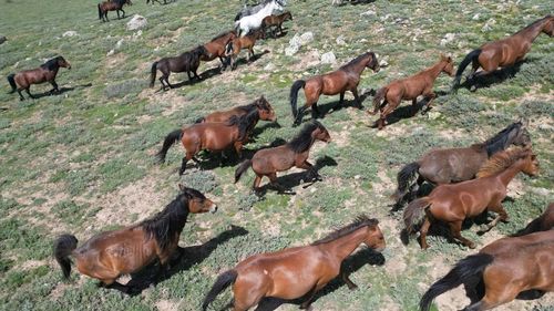 Afyonkarahisar'ın Emirdağ ilçesinde, yılkı atları doğal yaşam alanlarında dronla kaydedildi.
