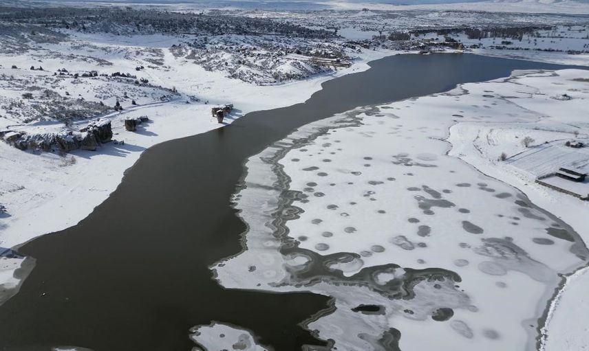 Hava sıcaklıklarının sıfır derecelerin altına düştüğü Afyonkarahisar'da donan Emre Gölü, yanı başındaki tarihi eserlerle birlikte etkileyici görüntüler oluşturdu.