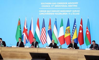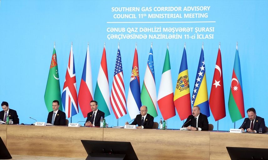 Enerji ve Tabii Kaynaklar Bakanı Alparslan Bayraktar (sağda), Bakü'de düzenlenen Güney Gaz Koridoru 11. Danışma Kurulu ve Yeşil Enerji Danışma Konseyi 3. Bakanlar Toplantısı'nda konuştu.