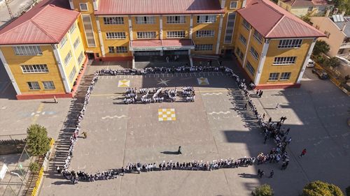 Van'ın Erciş ilçesindeki Tenzile Ana İlk ve Ortaokulu öğrencileri, Filistin bayraklarıyla 'Gazze' koreografisi oluşturarak saldırıları protesto etti.