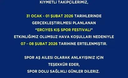 Spor A.Ş. tarafından yapılan paylaşımda, "31 Ocak - 01 Şubat 2026 tarihlerinde gerçekleştirilmesi planlanan \"Erciyes Kış Spor Festivali\" etkinliğimiz olumsuz hava şartları nedeniyle 07-08 şubat 2026 tarihine ertelenmiştir." ifadelerine yer verildi. Organizasyonun yeni tarihi 07-08 Şubat 2026 olarak açıklandı.