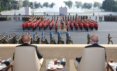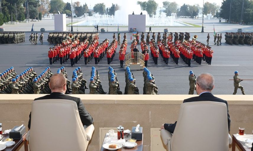 Erdoğan, vatan muharebesinde şehit düşenleri rahmetle andı, gazilere minnettarlığını dile getirdi ve Azerbaycan Silahlı Kuvvetleri’nin 30 yıllık işgali sonlandıran mücadelesini takdir etti. Konuşmasında "iki devlet, tek millet" şiarının askeri alanda da karşılık bulduğunu, Türkiye ve Azerbaycan askerlerinin omuz omuza durduğunu vurguladı.