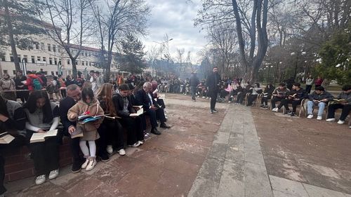 Erzincan'da Kütüphane Haftası kapsamında düzenlenen '81 İlde Kitap Okuyoruz' etkinliğinde yüzlerce öğrenci Saat Kulesi arkasında açık havada kitap okuyarak okuma kültürünü vurguladı.