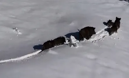 Görüntülerde sürünün kalın kar örtüsü üzerinde koşar adımlarla ilerlediği, zaman zaman duraksayıp yön değiştirerek toplu hareket ettiği, ardından dağlık alana doğru yönelip gözden kaybolduğu görülüyor.