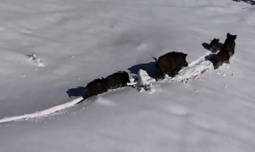 KARLI ARAZİDE İLERLEYEN DOMUZ SÜRÜSÜ HAVADAN GÖRÜNTÜLENDİ