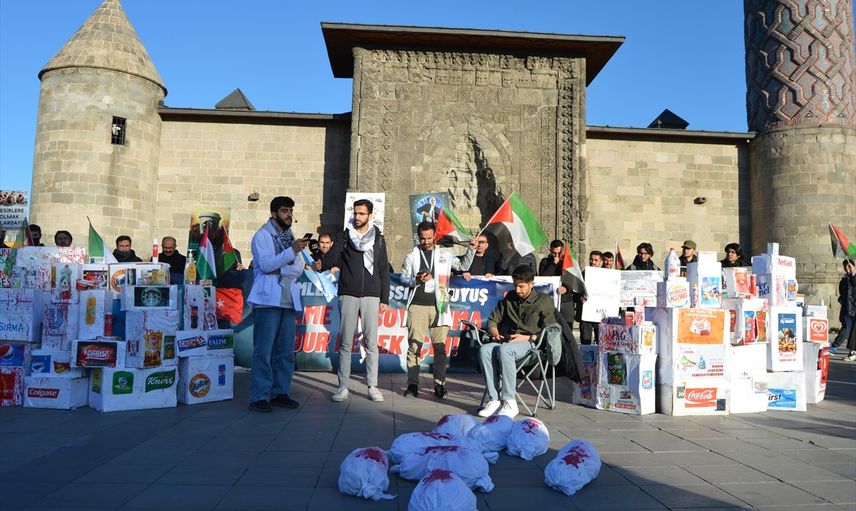 Yürüyüşte yer alan katılımcılar, medrese önündeki kutulara yazılmış olan İsrail’e ait ürünlerin boykot edilmesi gerektiğini vurguladı. Gruptan yapılan açıklamada, Atatürk Üniversitesi Tıp Fakültesi öğrencisi Yusuf Çiftçi, Türkiye'nin çeşitli illerinde 52 haftadır her cumartesi soykırıma karşı durduklarını ifade etti.