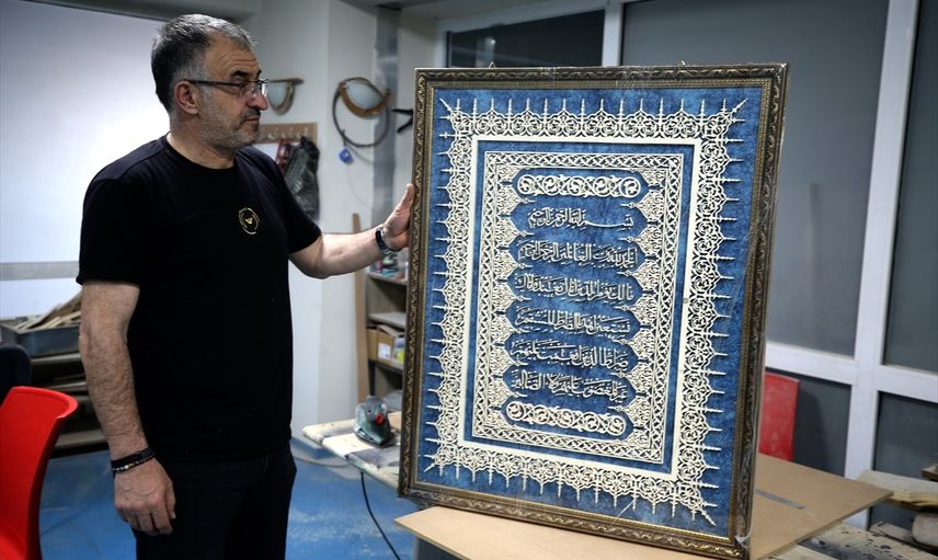 Filografi ve hat gibi farklı sanatların birleştiği eserler de üreten Yazıcı, projelerinin detaylarına ilişkin bir örnek vererek, “Fatiha Suresi tablosunun tasarımını yaptıktan sonra, kesim işlemine geçtik. Yapımında 7 bin matkap deliği bulunuyor ve bu eser 22 gün sürdü.” şeklinde konuştu.