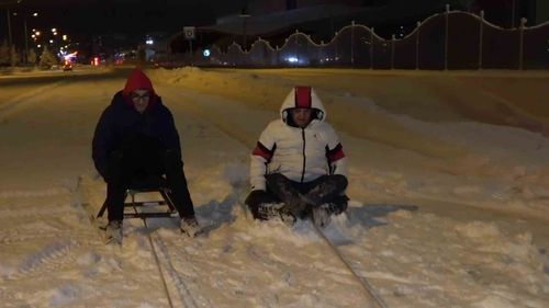 Erzurum Off-Road Doğa Sporları ve Macera Ekibi, trafiğe kapalı alanda araçlara bağladıkları lastik bot ve kızaklarla 30-40 cm karda, eksi 12 derecede keyifli anlar yaşadı.