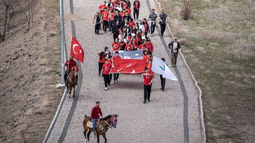 Erzurum'da, Ziyaeddin Fahri Fındıkoğlu İmam Hatip Ortaokulu öğrencileri, şehitleri anmak amacıyla 23 Nisan Ulusal Egemenlik ve Çocuk Bayramı etkinlikleri kapsamında Türk bayrakları ile ecdat yadigarı tabyalara yürüdü. Yürüyüş, 1877-1878 Osmanlı-Rus Savaşı sırasında önemli muharebelere ev sahipliği yapmış olan Topdağı'ndaki Aziziye…