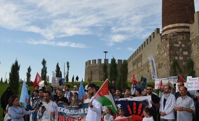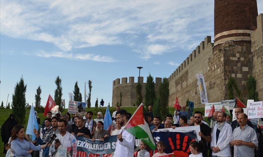 Erzurum Kalesi önünde toplanan doktorlar, tıp ve eczacılık fakültesi öğrencileri ile vatandaşlar, Türk, Filistin ve Doğu Türkistan bayrakları eşliğinde döviz ve pankartlarla yürüyüş yaptı.