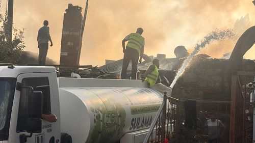 Erzurum'un Yakutiye ilçesi Kırmızıtaş Mahallesi'nde çıkan yangın rüzgarın etkisiyle bitişik evlere ve ahırlara sıçradı; itfaiye, sağlık ve polis ekipleri müdahale ediyor.