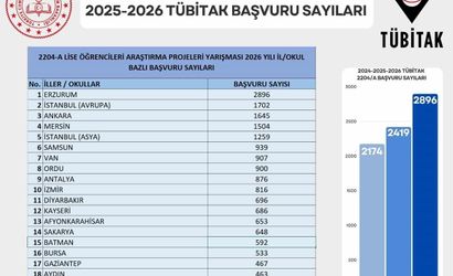 2025–2026 EĞİTİM ÖĞRETİM YILI KAPSAMINDA DÜZENLENEN TÜBİTAK 2204-A LİSE ÖĞRENCİLERİ ARAŞTIRMA PROJELERİ YARIŞMASI BAŞVURU SONUÇLARI AÇIKLANDI. AÇIKLANAN VERİLERE GÖRE ERZURUM, 2896 PROJE BAŞVURUSU İLE TÜRKİYE GENELİNDE BİRİNCİ SIRADA YER ALARAK ÖNEMLİ BİR BAŞARIYA İMZA ATTI.