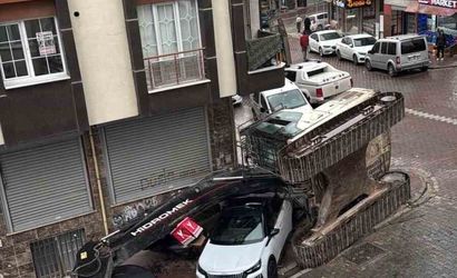 Kaza anı çevredeki güvenlik kamerasına yansıdı. Görüntülerde iş makinesinin devrildiği ve kepçesinin araçların üzerine düştüğü görülüyor.
