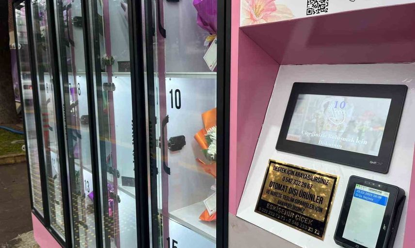 Anadolu Üniversitesi Yunus Emre Kampüsü'ne yerleştirilen çiçek otomatı, kampüs içindeki konumuyla ve sunduğu ürünlerle dikkat çekiyor. Eskişehir’de faaliyet gösteren çiçekçi tarafından rektörlük binasına yakın bir noktaya konumlandırılan otomatın içindeki çiçekler, öğrenci ve personelin ilgisini çekiyor.
