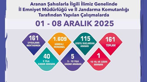 Eskişehir'de 1-8 Aralık'ta 161 aranan şahıs yakalandıİl Emniyet Müdürlüğü ve İl Jandarma Komutanlığı ortak çalışmasıEskişehir'de 1-8 Aralık tarihleri arasında İl Emniyet Müdürlüğü ve İl Jandarma Komutanlığı ekiplerince il genelinde aranan şahıslarla yönelik çalışmalar gerçekleştirildi.Operasyonlar 161 uygulama noktası ve bin 609…