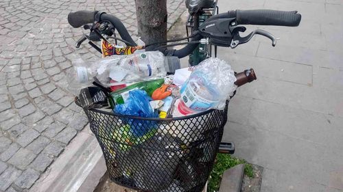 Eskişehir'de ağaca kilitli bisikletin sepeti çöp yığınına döndü