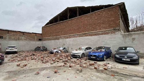 Yenibağlar Mahallesi'nde fırtına sırasında metruk binanın çatı duvarı Hacı Hüsnü Sokak'taki açık otoparka devrildi; 6 araçta maddi hasar oluştu, yaralanma yok.