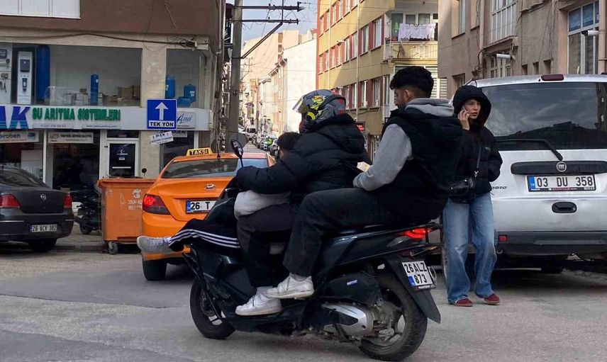 ESKİŞEHİR'DE SEYİR HALİNDEKİ BİR MOTOSİKLETE KASKSIZ VE KURALLARA AYKIRI ŞEKİLDE BİNEN 3 GENÇ KENDİLERİNİ VE TRAFİĞİ TEHLİKEYE SOKTU.