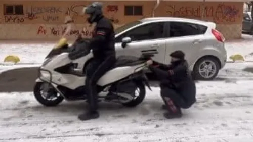 Eskişehir'de bir kurye, başka bir kuryenin motosikletine tutunup buzlu zeminde kaydığı anların görüntüleri sosyal medyada ilgi çekti.