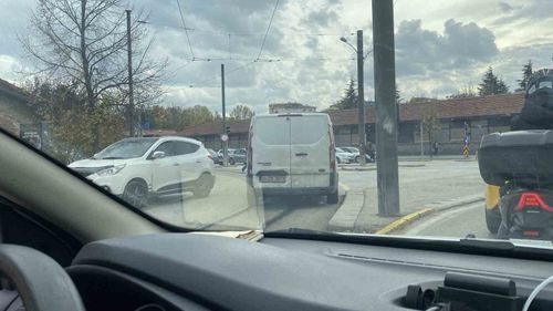Eskişehir Yenibağlar'da bir panelvan sürücüsü kırmızı ışığı beklemek yerine tramvay banketinden geçip dönüş yaptı; anlar cep telefonu kamerasına yansıdı.