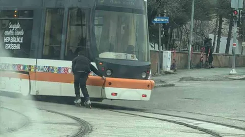 Eskişehir'de patenli çocuk tramvayın arkasına tutunarak tehlikeli hareket yaptı