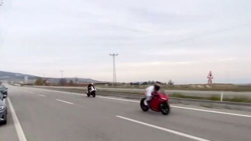 Eskişehir'de trafiğe açık Sarıcakaya Caddesi'nde iki motosikletin 200 km/saati aşan yarışı kaydedildi