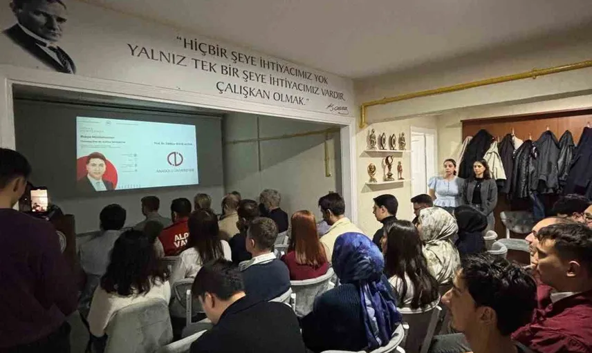 ESKİŞEHİR ANADOLU ÜNİVERSİTESİ ÖĞRETİM ÜYESİ VE TANINMIŞ TÜRKOLOG PROF. DR. ZÜLFİKAR BAYRAKTAR, KONFERANS VERİRKEN GÖRÜLÜYOR