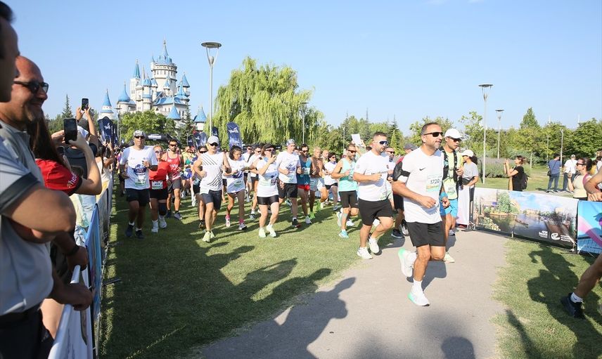 Sazova Bilim Kültür ve Sanat Parkı'nda düzenlenen koşu öncesinde sporcular, alanda ısınma hareketleri yaptı.