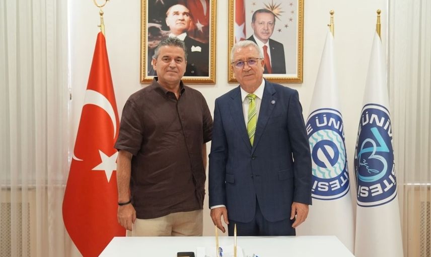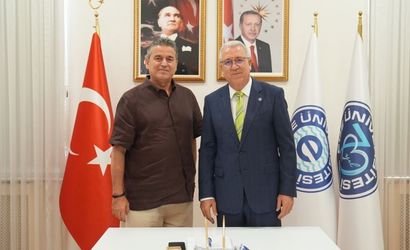 Ege Üniversitesi'nde (EÜ) hazırlanan projeyle, sanayi tesislerindeki karbondioksitin havaya salınmadan tutulması ve biyokütle, biyoyakıt ve biyoplastik gibi katma değerli ürünlere dönüştürülmesi hedefleniyor. EÜ Rektörü Prof. Dr. Necdet Budak (sağda), proje yürütücüsü Mühendislik Fakültesi Biyomühendislik Bölümü Öğretim Üyesi Prof. Dr. Nuri Azbar'ı (solda) kabul ederek başarı diledi.