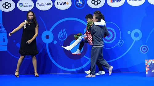 Hırvatistan'ın Zagreb kentinde düzenlenen Dünya Güreş Şampiyonası'nda 50 kiloda bronz madalya kazanan Evin, bacağı sargılı halde madalya törenine rakiplerinin kucağında getirildi.