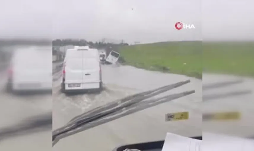 Eyüpsultan’da servis aracı su dolu kanalda yan yattı