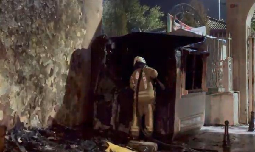 İSTANBUL FATİH’TE CAMİ DIŞINDAKİ GÜVENLİK KULÜBESİ ALEV ALEV YANDI.