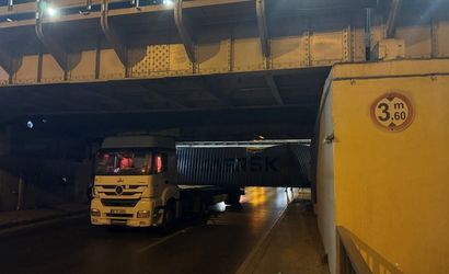 Fatih'te alt geçide takılan tırın dorsesindeki konteyner, yolun ulaşıma kapanmasına neden oldu.