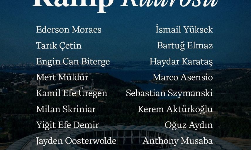 Fenerbahçe'nin 19 kişilik Samsunspor maçı kamp kadrosu: Ederson Moraes, Tarık Çetin, Engin Can Biterge, Mert Müldür, Kamil Efe Üregen, Milan Skriniar, Yiğit Efe Demir, Jayden Oosterwolde, Çağlar Söyüncü, Levent Mercan, İsmail Yüksek, Bartuğ Elmaz, Haydar Karataş, Marco Asensio, Sebastian Szymanski, Kerem Aktürkoğlu, Oğuz Aydın, Anthony Musaba, Jhon Duran.