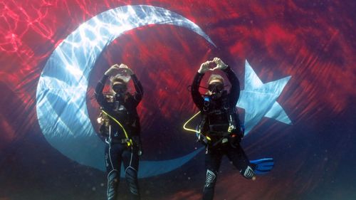 Muğla Fethiye’de bir grup dalgıç, denizin dibinde Türk bayrağı açtı.