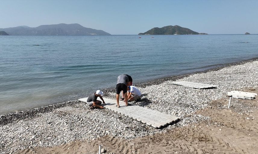 Muğla'nın Fethiye ilçesinde belediye tarafından işletilen plajda, engellilerin denize girmesini kolaylaştırmak amacıyla düzenleme yapıldı.