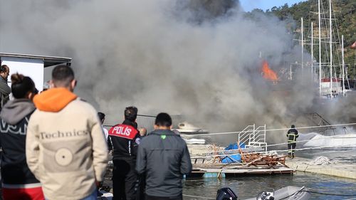 Fethiye'de yanan 3 tekneye karadan ve denizden müdahale ediliyor. Yangın, Karagözler Mahallesi'nde başladı.