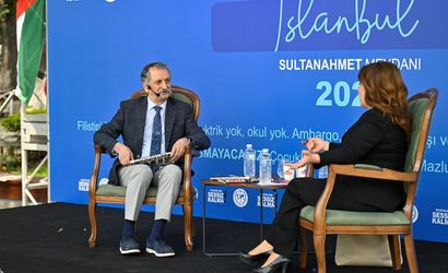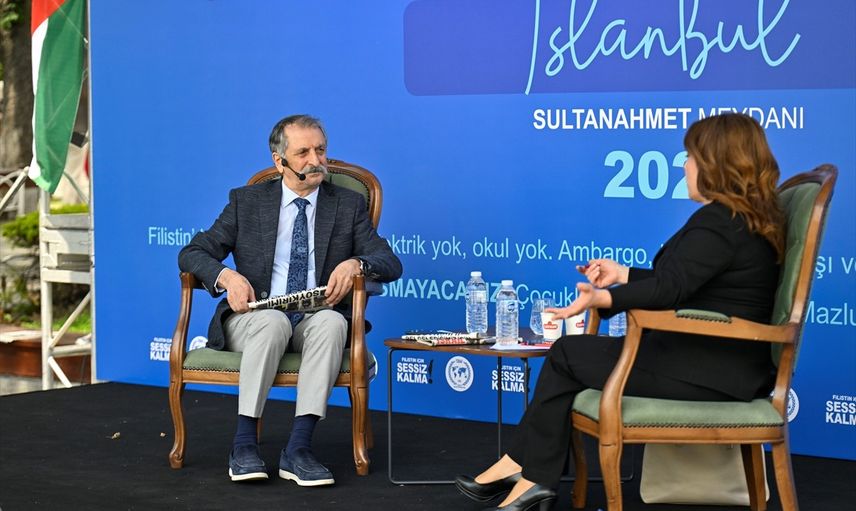 Türkiye Basın Federasyonunun öncülüğünde, İsrail'in Filistin'deki insanlık dışı politikalarını protesto etmek amacıyla Sultanahmet Meydanı'nda yapılan ve 24 saat süren "Filistin İçin Sessiz Kalma" canlı yayını sona erdi. Gazeteci Ahmet Varol (solda), canlı yayına katılarak konuşma yaptı.