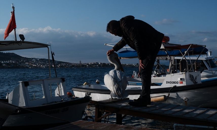 İzmir'in Foça ilçesinde yaralı olarak sığındığı balıkçı barınağında 4 yıldır yaşamını sürdüren ve "Tosun" adı verilen pelikan ilçenin maskotu oldu.