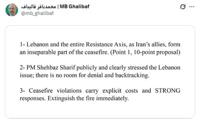 Galibaf, paylaşımında sunulan maddeleri hatırlatarak, "İran’ın müttefikleri olan Lübnan ve tüm direniş ekseni, ateşkesin ayrılmaz bir parçasını oluşturmaktadır. (10 maddelik teklifin 1. maddesi)." ifadelerine yer verdi.