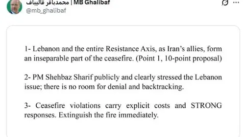 Galibaf: Lübnan, ABD ile varılan 15 günlük ateşkesin ayrılmaz parçasıdır; ihlaller sert karşılık doğurur