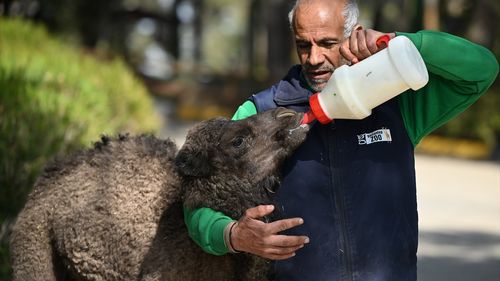 Gaziantep Doğal Yaşam Parkı'nda 10 gün önce doğan 'Boncuk' adlı deve yavrusuna bakıcıları özel ilgi gösteriyor.