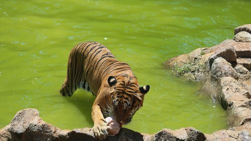 Gaziantep Hayvanat Bahçesi sakinleri, mevsim normallerinin üzerinde seyreden sıcak hava koşullarında özel olarak hazırlanan meyveli ve etli buzlu kokteyllerle serinliyor. Termometrelerin 38 dereceyi gösterdiği Gaziantep'te, hayvanat bahçesindeki hayvanlar için yaz mevsimine uygun yiyecekler özenle hazırlanıyor. Kaplan ve aslan gibi yırtıcı…