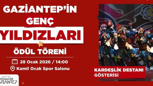 Gaziantep Büyükşehir Belediyesi'nin 'Genç Yıldızları Ödül Töreni'nde Gazi Oyunları ve TEKNOFEST ödülleri verilecek; 'Kardeşlik Destanı' gösterisi 28 Ocak 2026'da sahnelenecek.